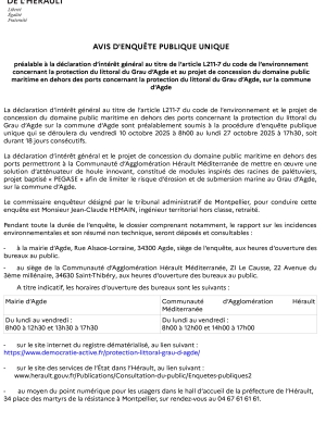 La déclaration d’intérêt général au titre de l’article L211-7 du code de l’environnement et le projet de concession du domaine public maritime en dehors des ports concernant la protection du littoral du Grau d’Agde sur la commune d’Agde sont préalablement soumis à la procédure d'enquête publique unique qui se déroulera du vendredi 10 octobre 2025 à 8h00 au lundi 27 octobre 2025 à 17h30, soit durant 18 jours consécutifs.
