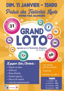 Le 11 Janv. 2026 Lire plus Grand loto de la Calandreta Dagtenca Dimanche 11 janvier 2026, à 15h, Grand Loto organisé par la Calandreta Dagtenca avec... 15:00 Palais des Festivités