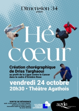 Le 24 Oct. 2025 Lire plus Hé Cœur - Sortie de résidence "Hé Cœur" >> par “Dimension 34” “Hé... 20:30 THÉÂTRE AGATHOIS