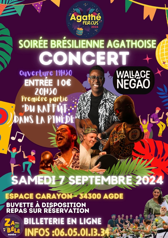 Soirée-concert 100% brésilienne avec en première partie le concert Pagode « Du Raffût dans la Pinède » suivi de « Wallace Negão ».