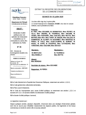 Délibération n°26 du Conseil Municipal du 15 juillet 2025 relative à la sollicitation du Préfet dans le cadre de la DUP pour une opération de restauration immobilière sur 10 immeubles en centre-ville