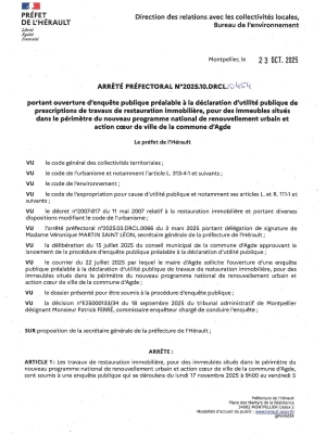 Arrêté préfectoral n°2025.10.DRCL.0454 en date du 23 octobre 2025 portant ouverture d'enquête publique préalable à la déclaration d'utilité publique de prescriptions de travaux de restauration immobilière
