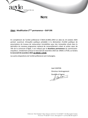 Note complémentaire à l'arrêté préfectoral n°2025.10.DRCL.0454 en date du 23 octobre 2025 prévenant la modification de l'heure de la 2ème permanence du commissaire enquêteur